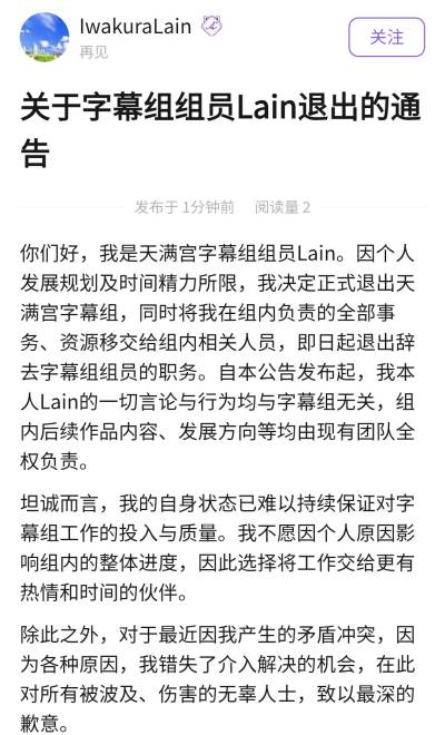 之后,IwakuraLain在文章MA112969中宣布退出天满宫字幕组,并向因他产生的矛盾冲突中所有被波及和伤害的无辜人士致以最深的歉意。